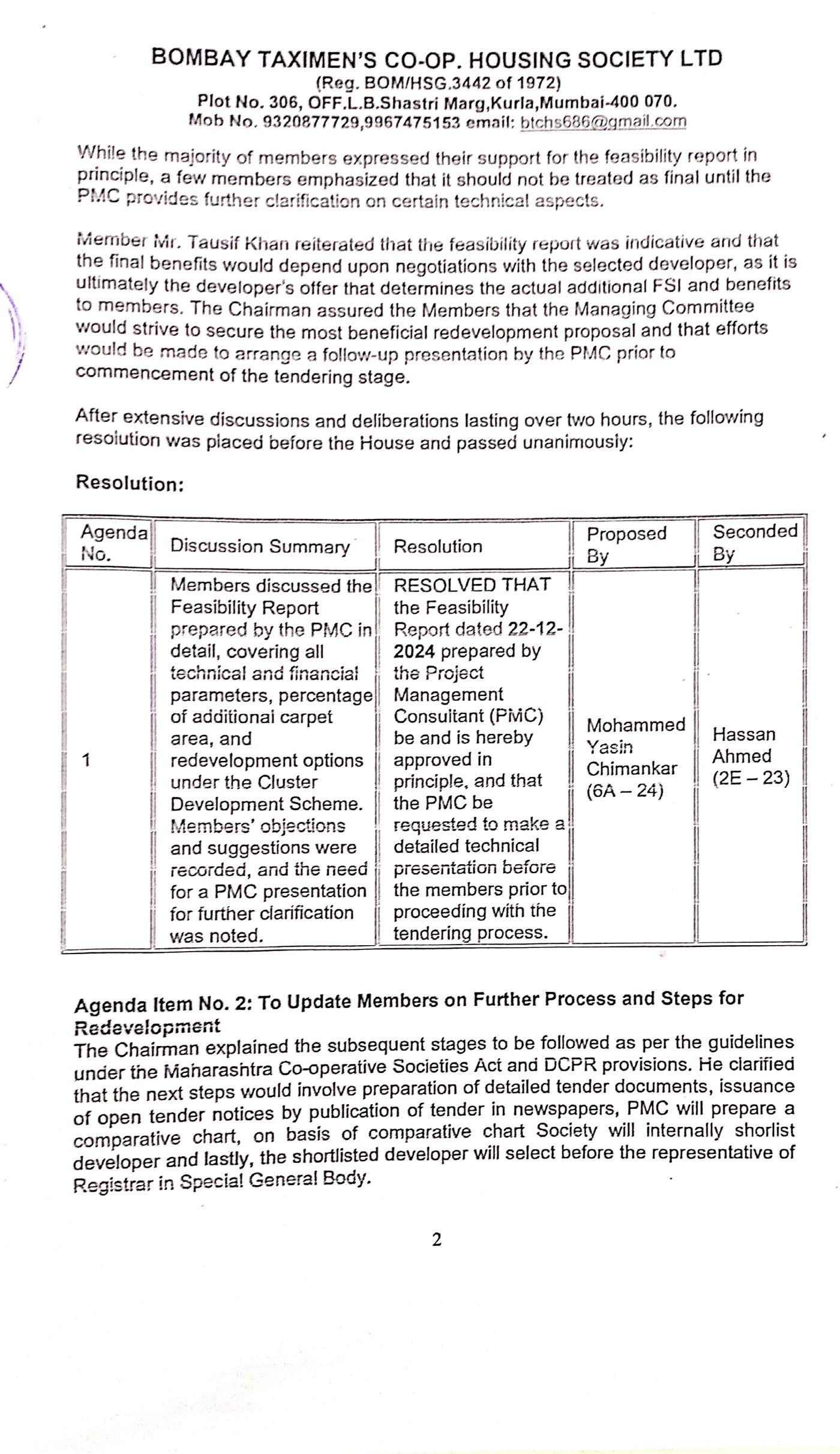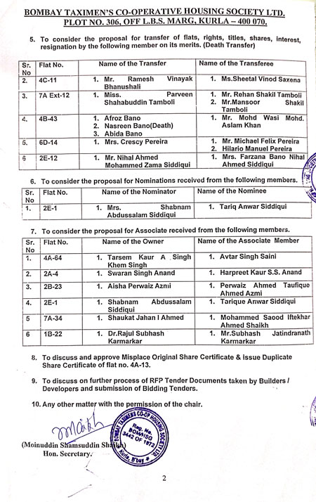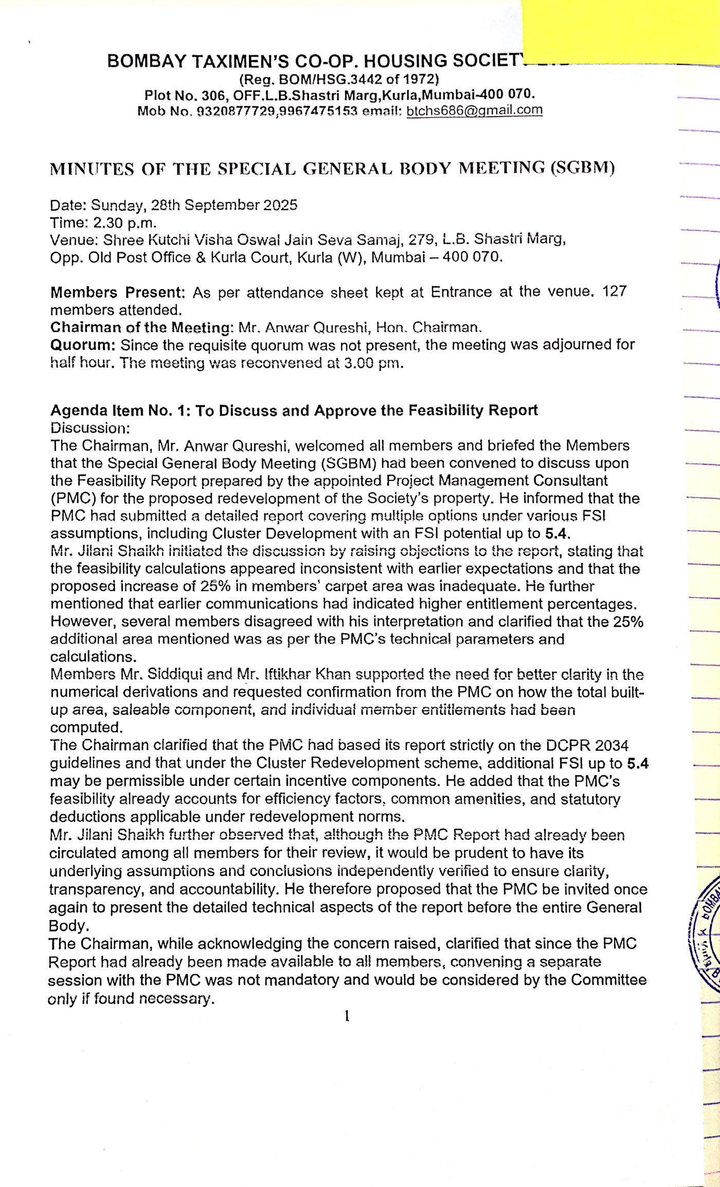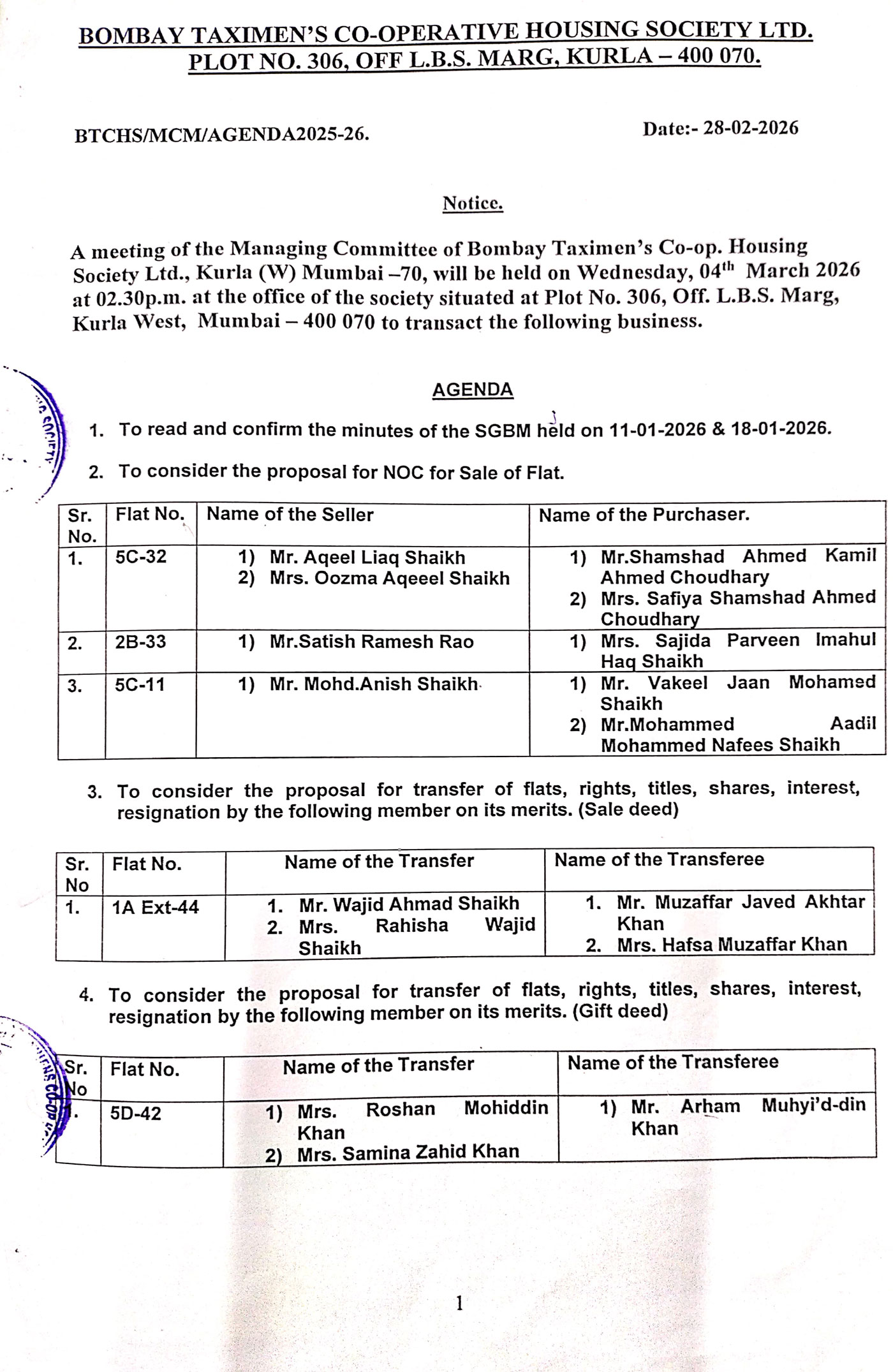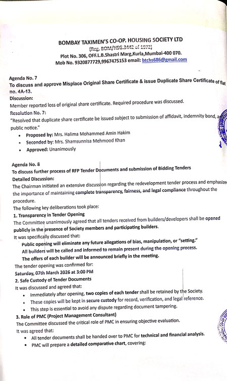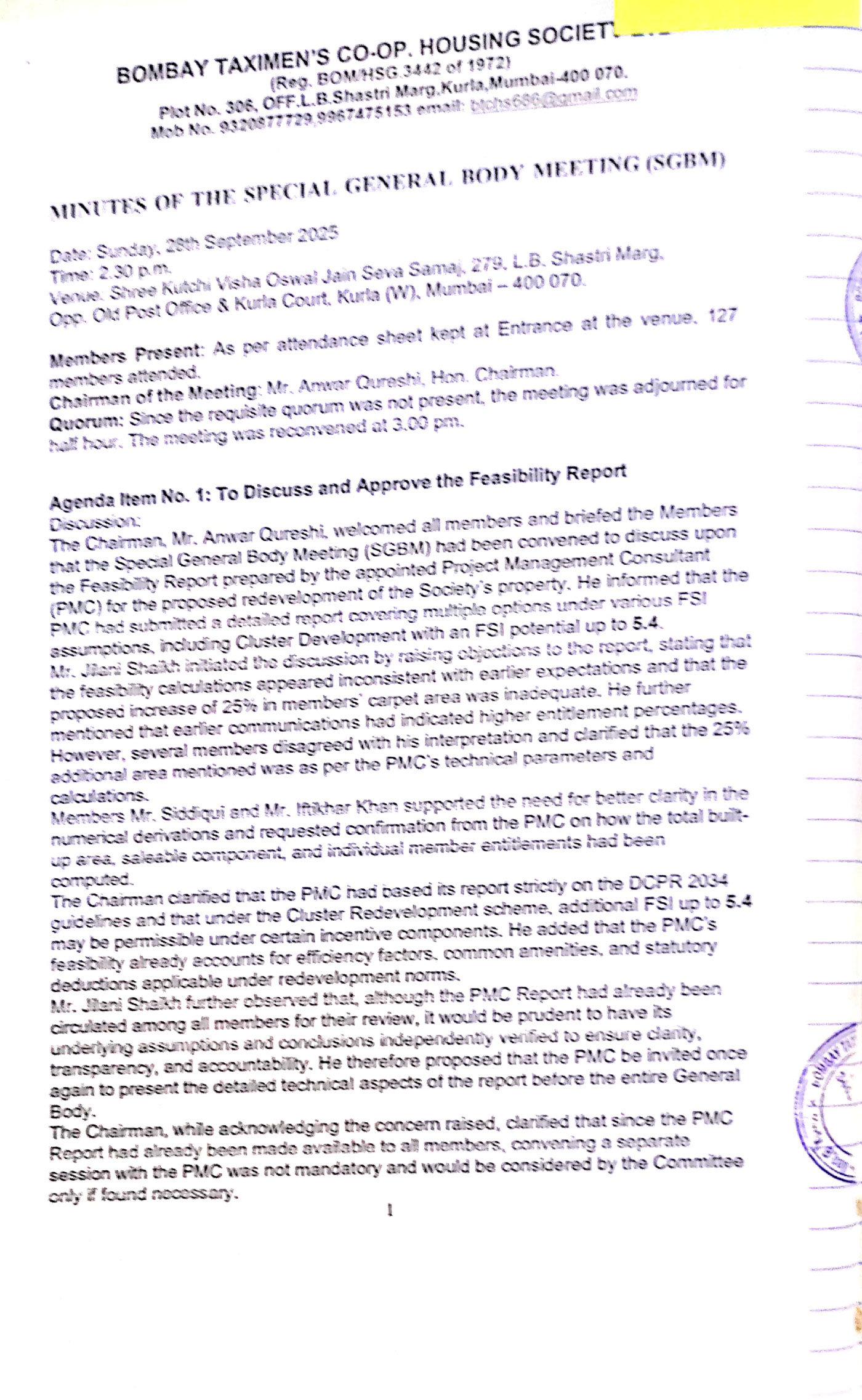 The plot area of C.T.S.No.147 of Village Kurla-4 as per the Property Card is 34,354.80 sq.mt., out of which area of in the name of Bombay Taximen’s C.H.S. Ltd. is 28,424.00 sq.mt. and In possession of 5828.60 sq.mt. Hence at present, the plot area to be considered for the redevelopment is 34,354.80 sq.mt.